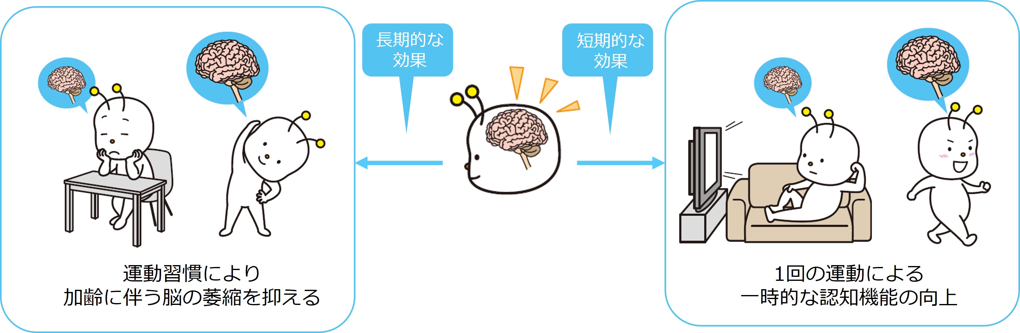 これまでの研究から、加齢により脳が萎縮すると認知機能が低下することがわかっています。また日常的に身体を動かしていると、脳の大きさが保たれ、認知機能低下が穏やかになると考えられています。