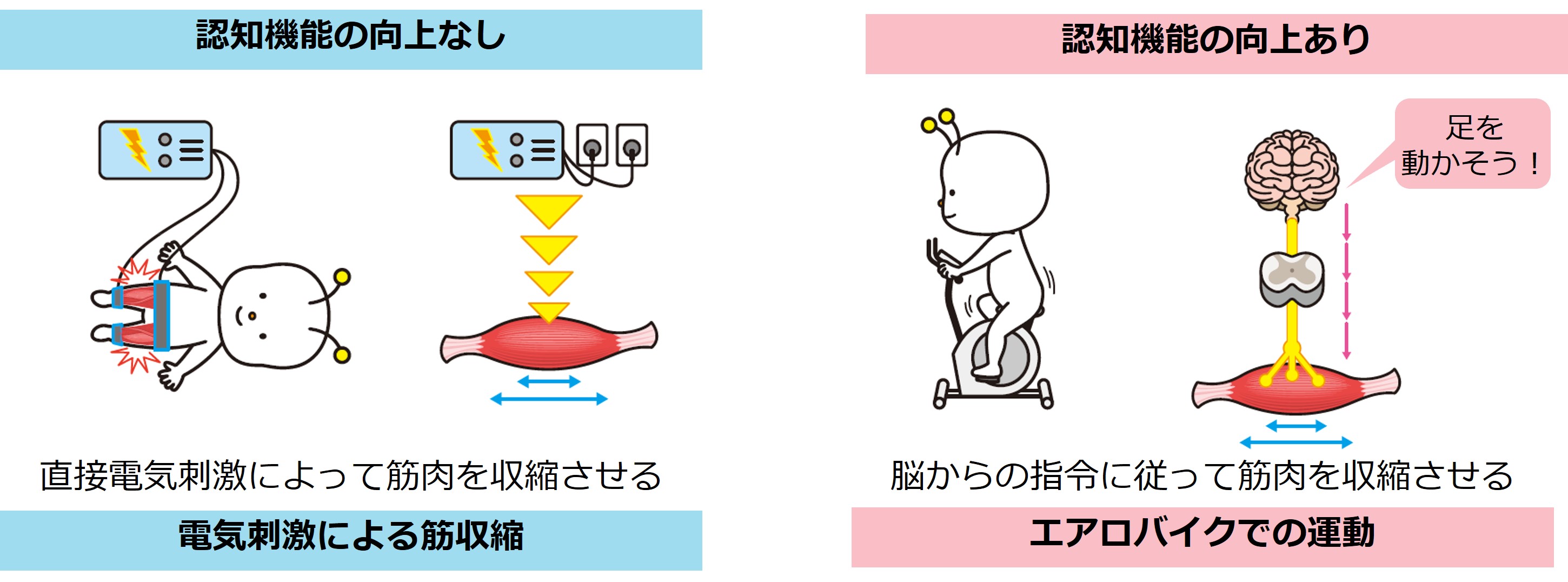 私たちの研究では、電気刺激で筋肉を動かすグループと、エアロバイクを自分の意思で漕ぐグループに分けて、運動の前後に認知機能を測定しました。するとエアロバイクを漕ぐグループのみ、運動後に認知機能の向上がみられました※3,4。電気刺激による運動は、脳から筋肉への「動け!」という指令なしに筋肉が動くのに対し、エアロバイクでは脳から「ペダルを漕いで!」という指令が筋肉に伝わって動く、という違いがあります。この結果から、脳の健康には、まず自分の意思で身体を動かすことが重要なポイントだといえそうです。自分の意思で脳の健康を支える"自力作善"な健康づくりに、ぜひ挑戦してみましょう!