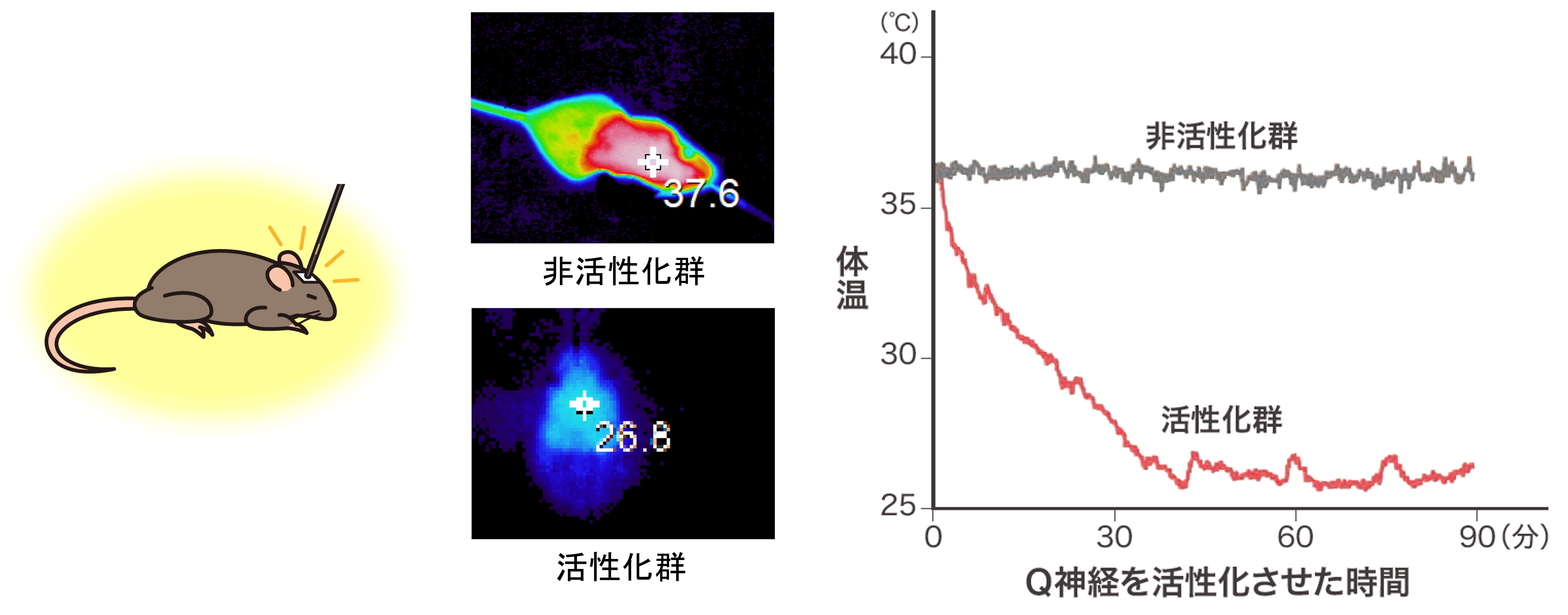 近年、私たちの研究グループでは、冬眠しない動物(マウス)で、冬眠に似た状態を作り出すことに成功しました。脳の視床下部にある神経細胞群(Q神経)を、光遺伝学*という手法を用いて活性化させると、マウスの心拍数が急激に低下するとともに、体温と代謝が著しく低下する「冬眠様状態」になることがわかりました。