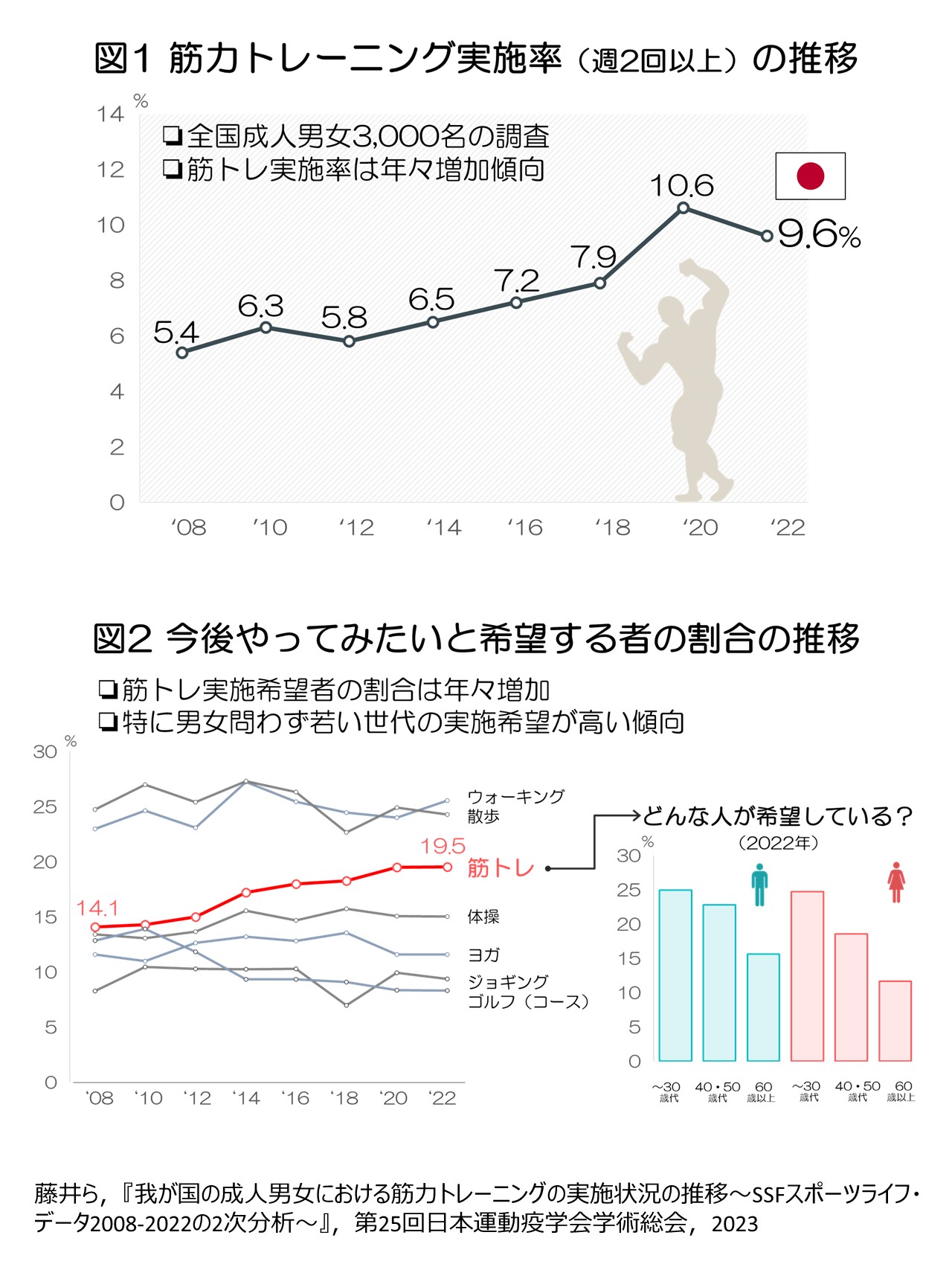 また、スポーツ実施率に関する全国調査のデータを分析した際に、週に2日以上筋トレする人は、過去14年間で右肩上がりであるものの、いまだわずか10%に満たないことを確認しました(図1)。欧米諸国での実施率は大体20-30%程度であると報告されていることを踏まえると、まだまだ伸びしろがあると感じます。今後筋トレを始めたいと考えている日本人も、若い世代の男女を中心に年々増加しているので(図2)、そういった人たちにしっかりとアプローチできるような研究をしていきたいです。