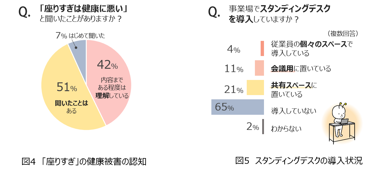 「座りすぎは健康に悪い」ということを9割以上の担当者が認知していることがわかりました(図4)。また、昇降式デスクは33%の企業で導入されており、目的によって導入場所を選択する傾向がみられました(図5)。