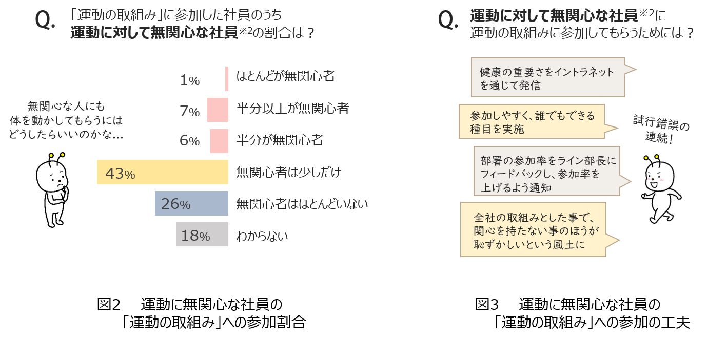 また、運動に対して無関心な社員※2の「運動の取組み」への参加割合をたずねたところ、「無関心者は少しだけ」「無関心者はほとんどいない」という回答が多くみられ、無関心者へのアプローチには課題があることがうかがえました(図2)。しかし、無関心な社員を取り込むために、プログラムへの参加率を組織の長にフィードバックしたり、全社的に実施する風土をつくったりするなど、組織ぐるみで取り組んでいる企業があることも確認できました(図3)。
