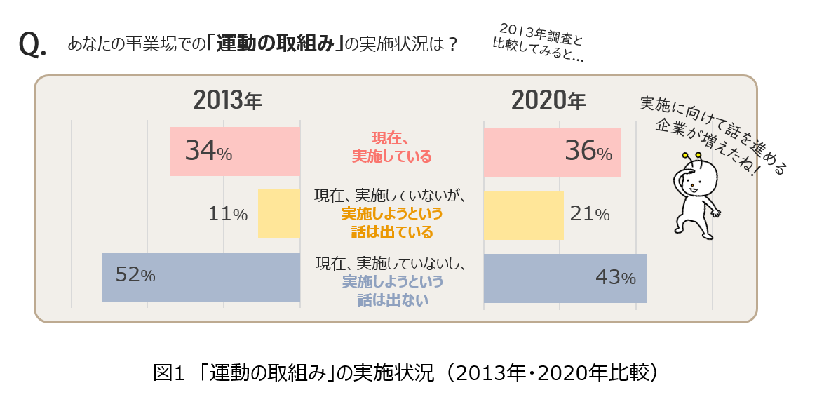 事業場での「運動の取組み」の実施状況についてたずねたところ、2013年と比較して※1「企業における運動を活用した健康づくり」が、少し前進したことが確認されました(図1)。
