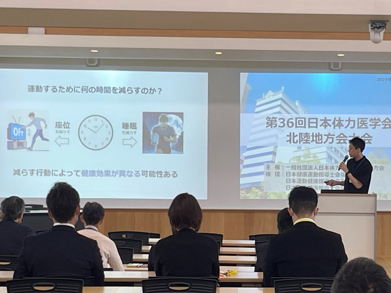 北濃研究員が第36回日本体力医学会 北陸地方会大会の特別講演に登壇し、「勤労者に広がる座りすぎの健康被害とその対策」をテーマに、MYLSスタディ®からの研究成果を中心に発表しました。