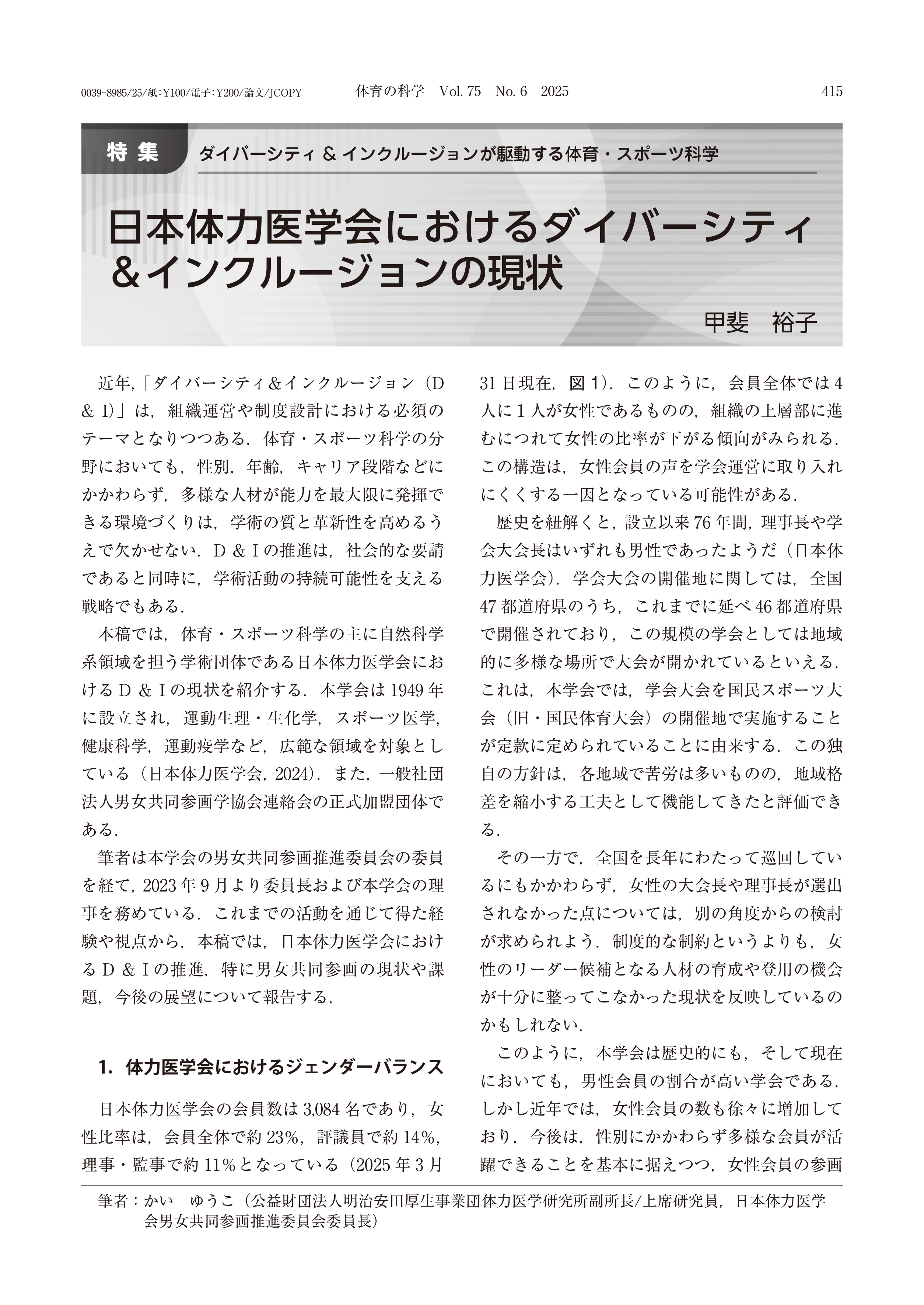 近年、推進されている「ダイバーシティ&インクルージョン(D&I)」は多様な人材が能力を最大限に発揮できる環境づくりを目指すもので、学術活動の持続可能性を支える戦略でもあります。本論文では、甲斐副所長が男女共同参画推進委員長を務める日本体力医学会における現状や課題、今後の展望について報告するとともに、体育・スポーツ・健康関連の学術領域において広がりを見せているD&I推進の動きを紹介しました。