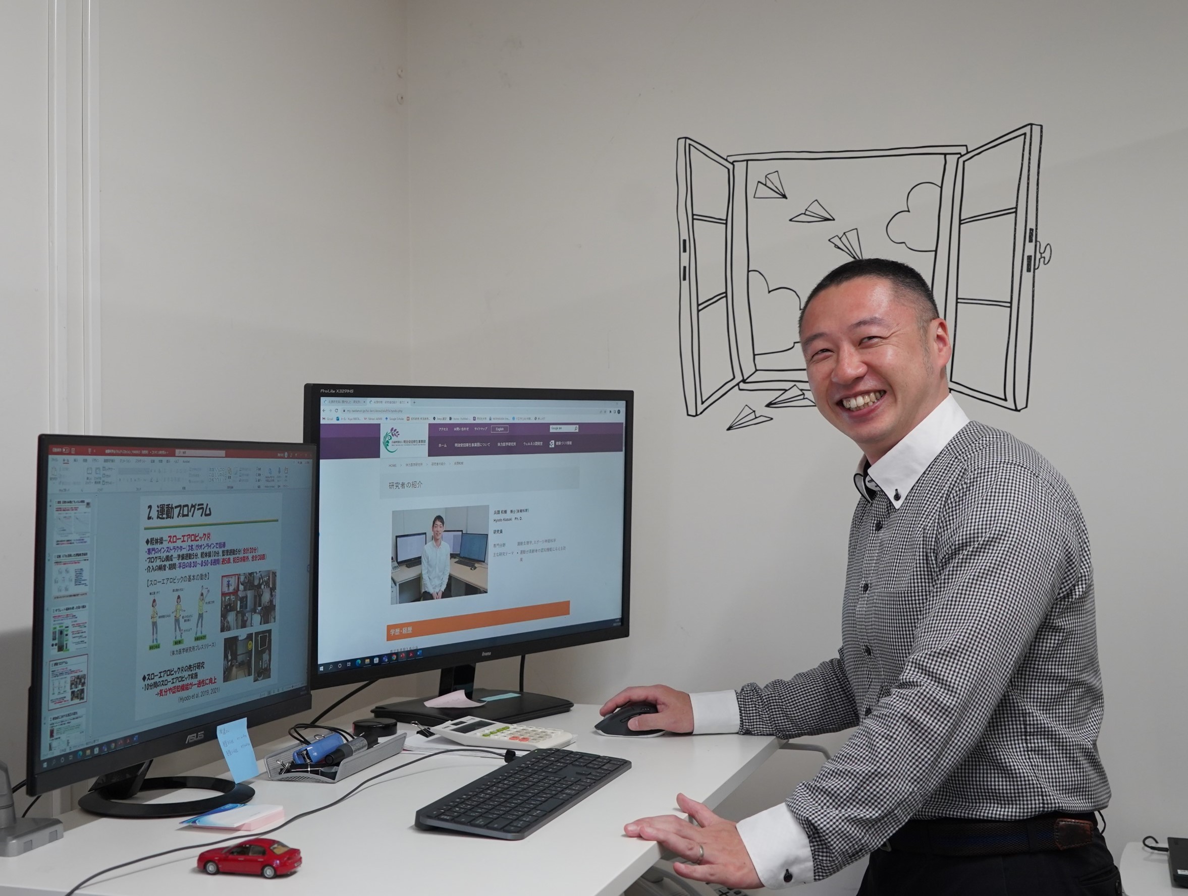 研究に参加した高齢者の自宅に機材を設置し、3か月間プロのインストラクターによる「スローエアロビック」のオンラインレッスンを提供しました。高齢者の心身にポジティブな効果が確認されたので、現在はこの研究成果をまとめた論文を執筆中です。