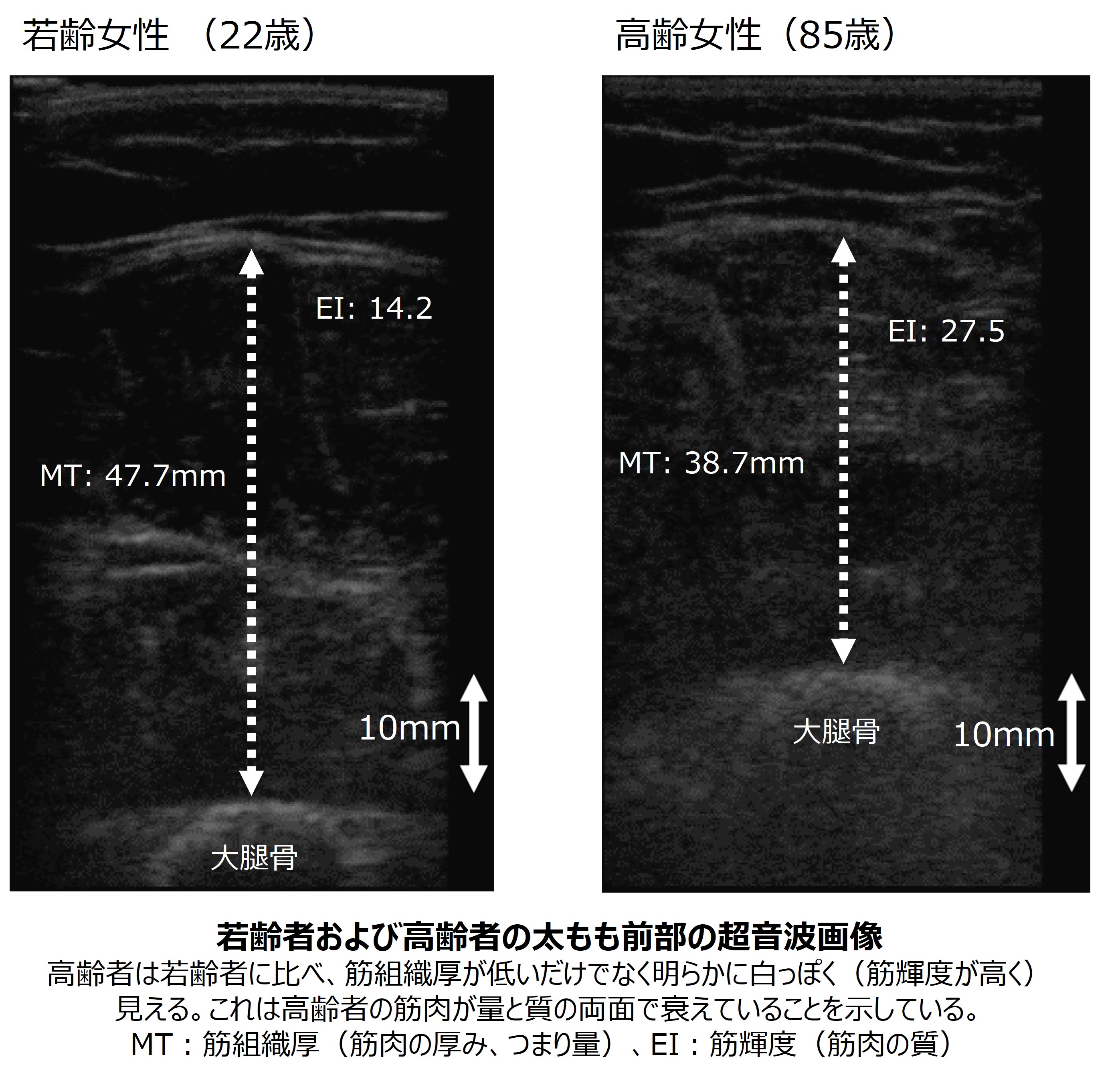 エコー画像(下図参照)で白く映る部分には脂肪などが含まれています。黒に近い部分が多いほど筋肉の質が良いと言えます。