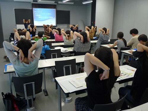 1日目の「唾液で分かるストレス度チェック」では、唾液アミラーゼ測定と結果説明会を行いました。2日目の「使える!すぐ分かるストレスチェックと解消法」では、リラックス&リフレッシュ体操を体験していただき、体操前後の唾液アミラーゼ測定で変化をみました。2日間で計120名の方にご参加をいただき、好評なうちに終えることができました。