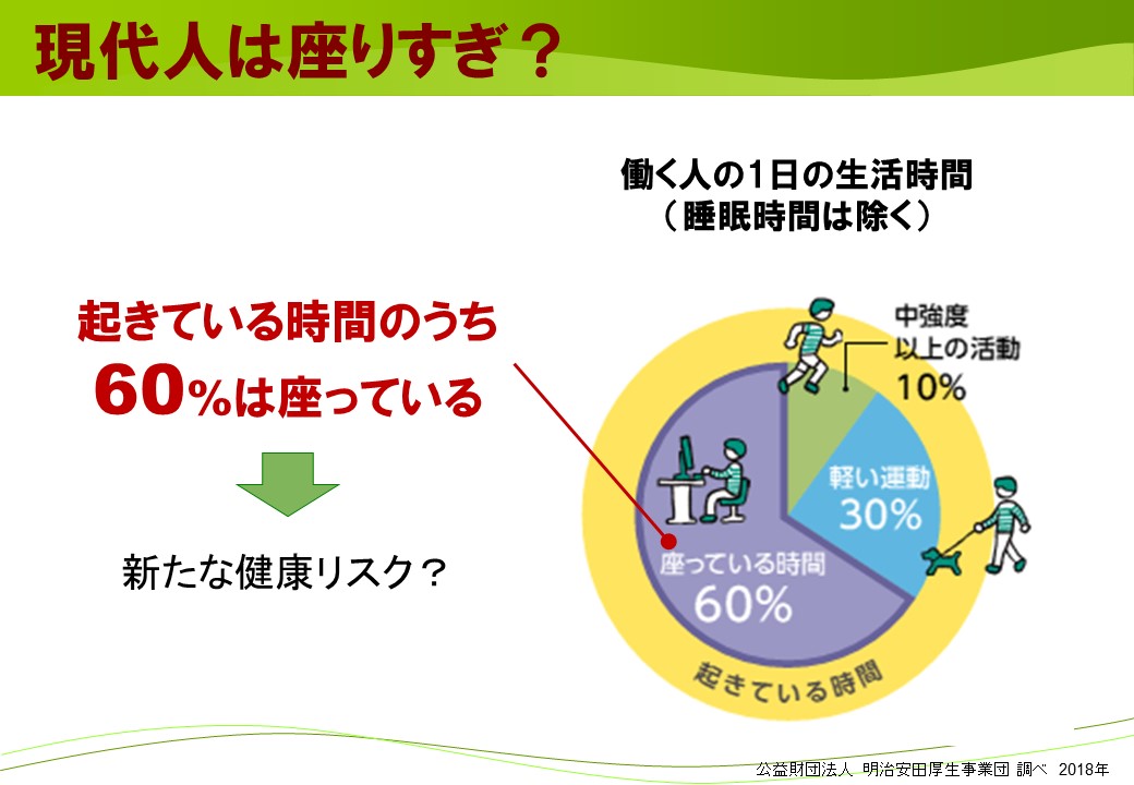 「業務体系に合った内容で、統計データーを交えての説明は、大変勉強になった。特に「座りすぎチェックシート」は、座りすぎの実態を把握でき、意識改善の良い機会になった。今回紹介された事例を職場や日常生活のなかで実践したい」とのご感想をいただきました。