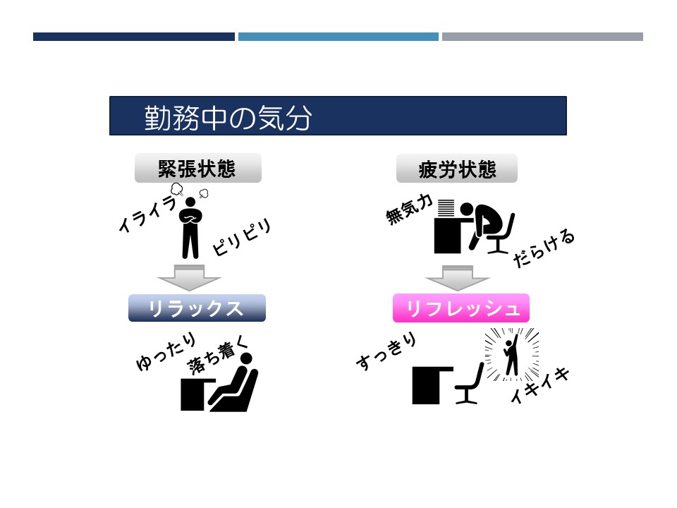 今回は、ストレスが心や身体におよぼす影響をわかりやすく紹介し、心の健康や疲労度をセルフチェックしていただきました。また、オフィスで手軽にできる体操を実施し、体操前後の気分の変化を確認しました。