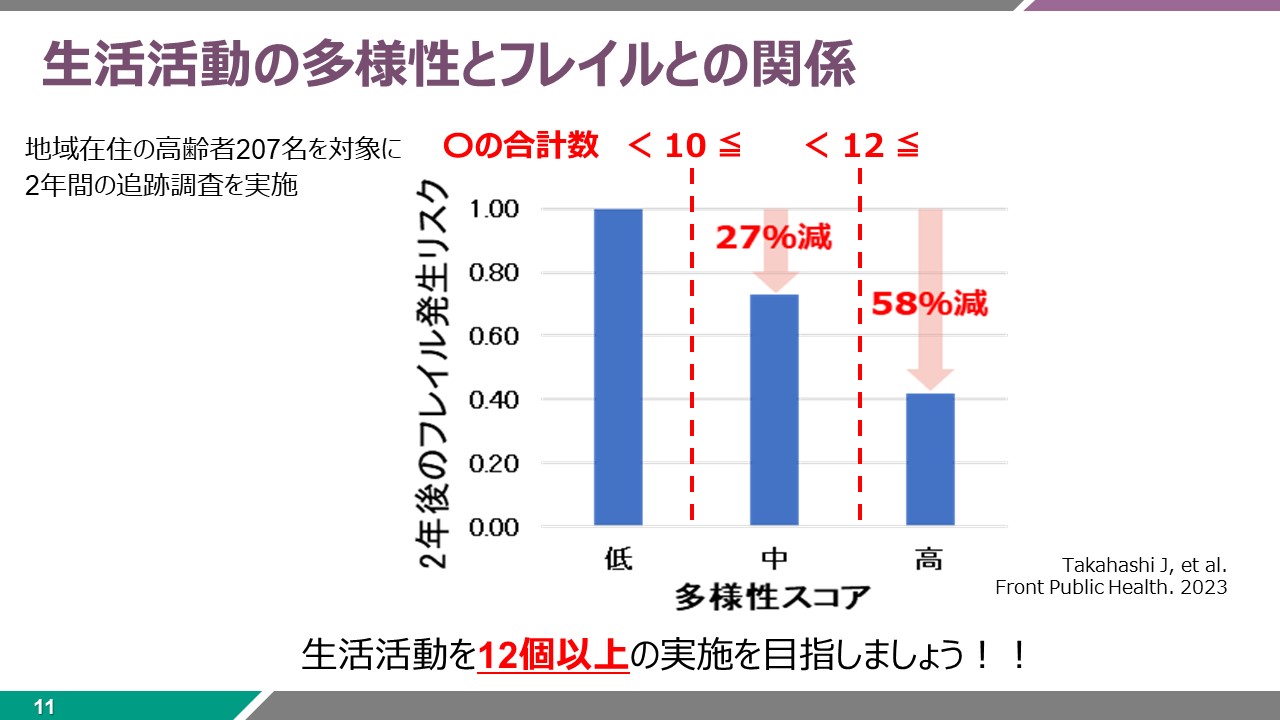 今回は「『運動さえしていれば大丈夫!』 これって本当?~高齢期における多様な生活活動の重要性~」をテーマに、生活活動の多様性とフレイルとの関係について講演を行いました。また、「生活活動の多様性の評価表」を用いて参加者自身の状況を確認していただきました。
