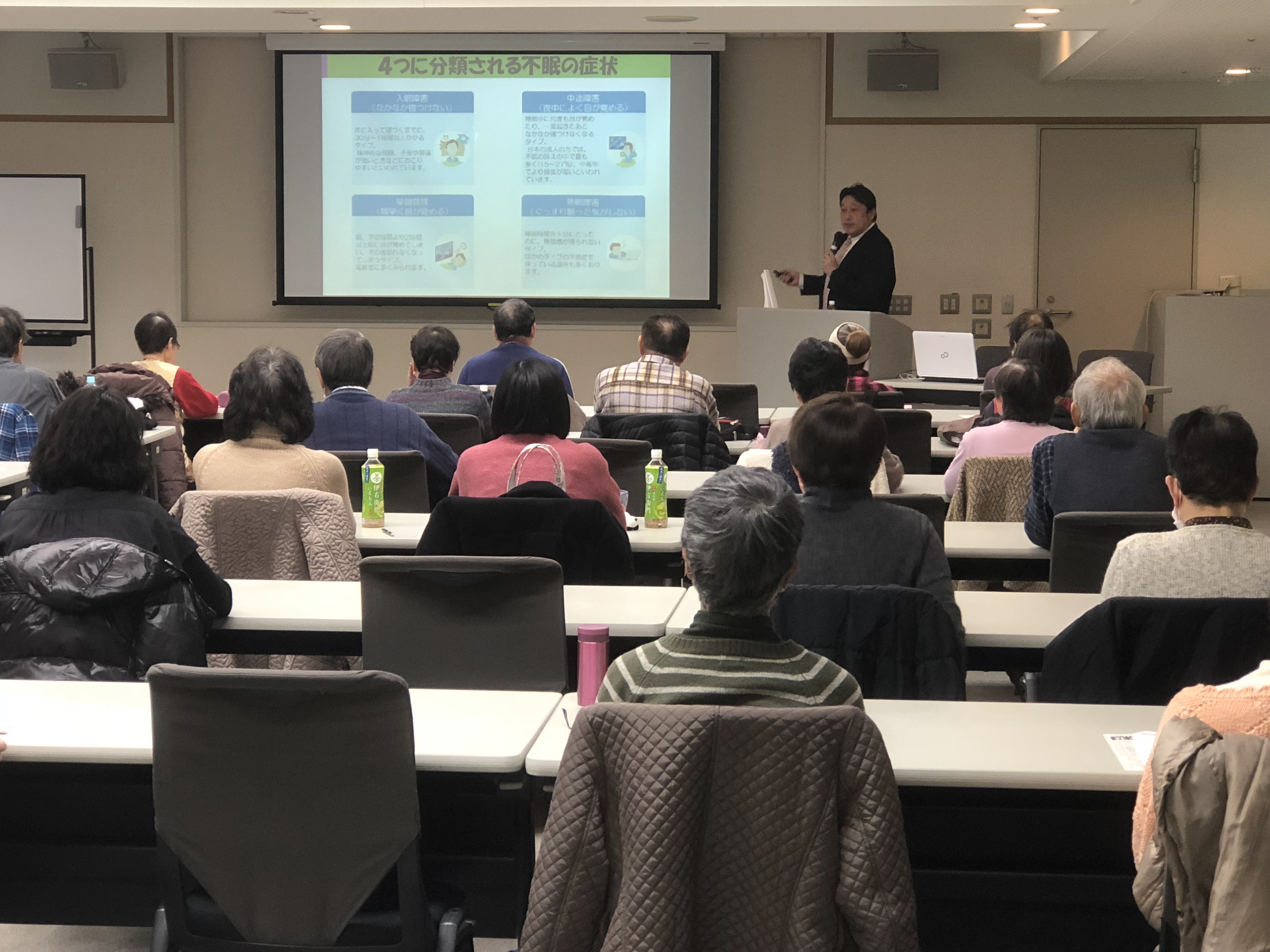 高齢者を対象に睡眠の最新知識を知り、良質な睡眠のとり方を学ぶことで、よりよい生活を営むことを目的として開催されました。講演では最初に簡単な快眠セルフチェックを行い、快眠のための具体的な方法や習慣的な運動による睡眠への効果について解説しました。「眠れない、なかなか寝付けない」とお困りの方が多い中、参加者からは「運動習慣が大切なことがよくわかった」「睡眠に対する考え方が変わった」などのご感想をいただきました。