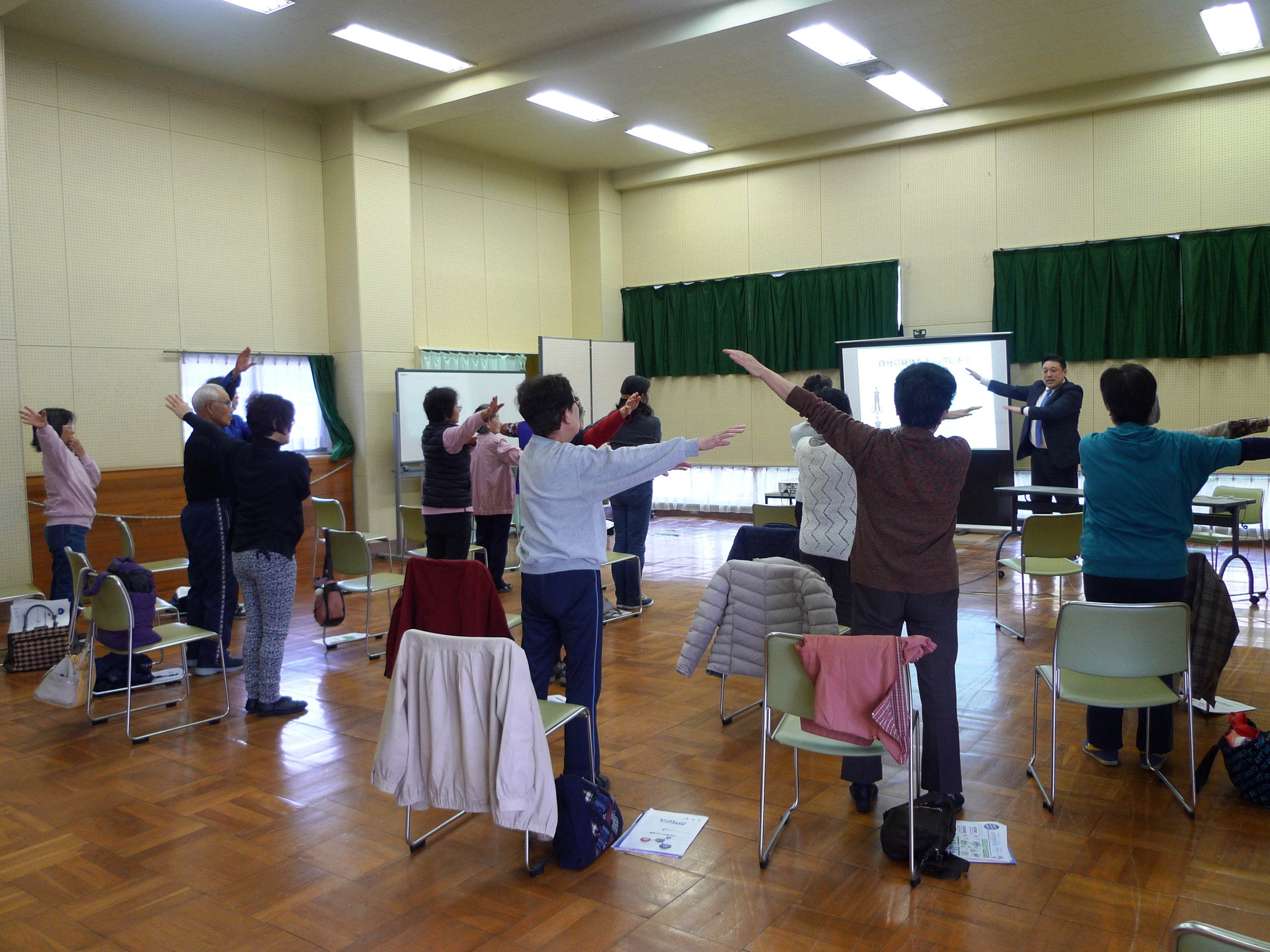 日頃、運動をしているかを問いかけたところ、ほとんどの方の手があがるくらい元気な方たちで、力だめし運動「スタンツ」や立ち上がり動作からパワー・スピード・バランス能力を評価する「運動機能測定」を実施したところ、どの動きもスムーズに行うことができました。今回の講演会や体験を機に、参加者の皆さんがさらに元気になってくださることを願っています。