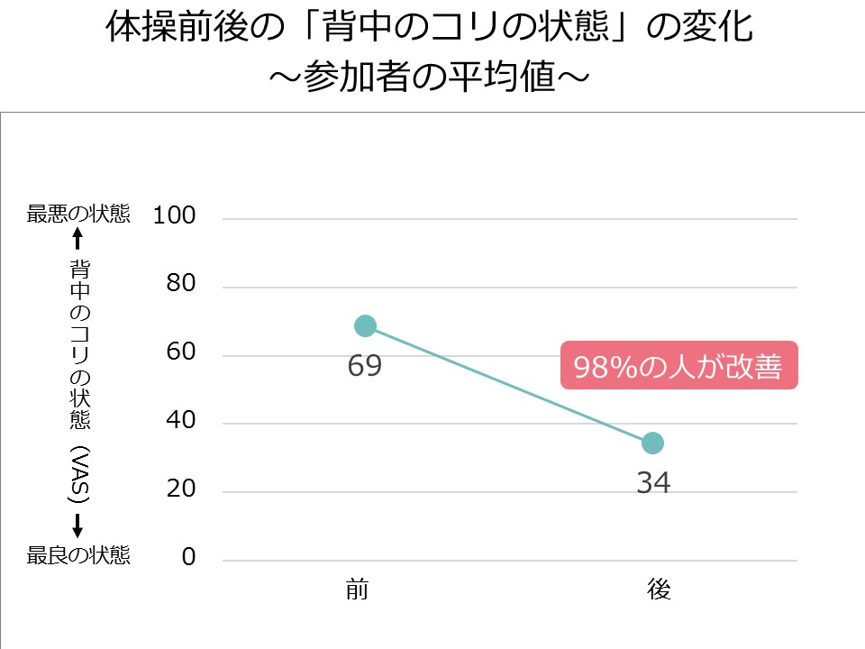 参加者の多くは営業活動に車を使っており、慢性的な運動不足状態でほぼ全員の方が背中のコリを感じていました。フェルデンクライスメソッド※を活用した簡単にできる背中ほぐし体操をご紹介し、その前後で姿勢の癖やコリの状態をチェックしながら効果を確認したところ、98%の方に改善がみられました(下図参照)。