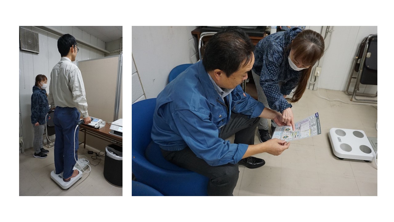 年に1回の健康診断のタイミングで、自分の体の筋肉量や脂肪量について興味をもっていただくことを目的として、開催されました。この測定では、健診結果からわかるBMIや体脂肪率だけでなく、筋肉量を部位別に分析した筋肉総合評価や筋肉量左右バランスチェックも行います。