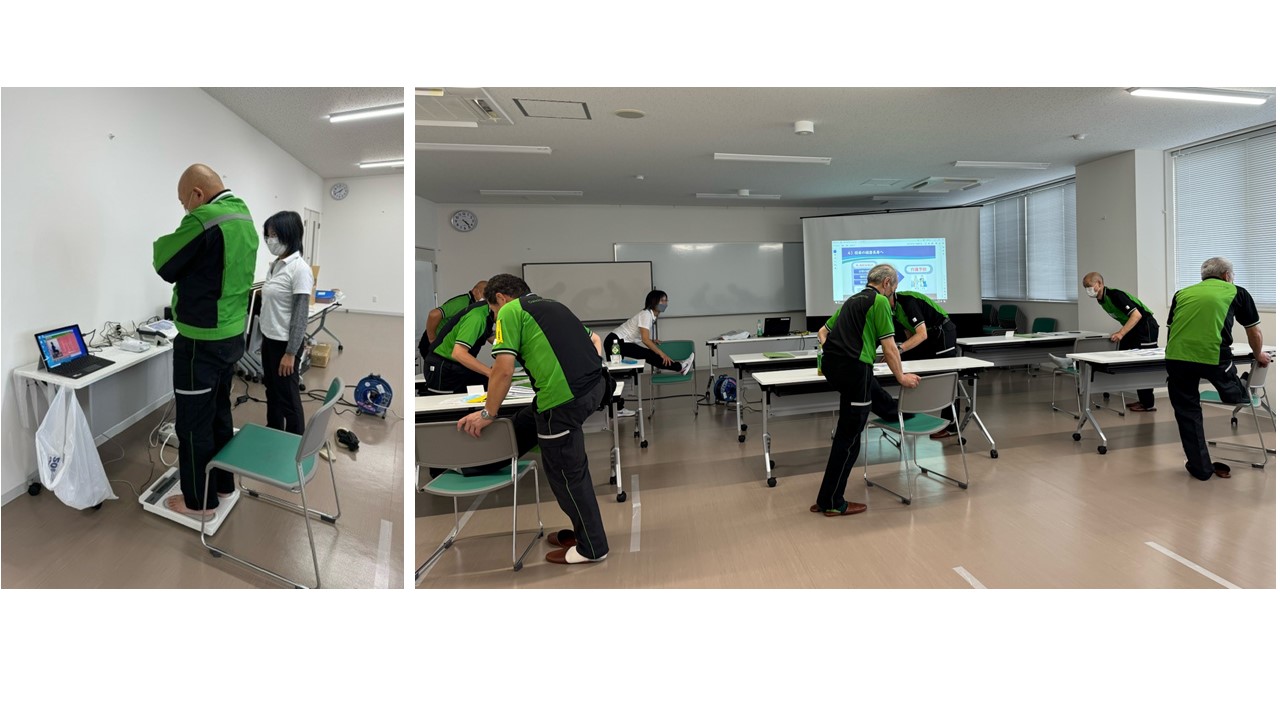測定後、加齢にともなう健康状態の変化や運転職に特徴的な健康リスクの講話、お勧めしたい簡単な体操を体験していただきました。