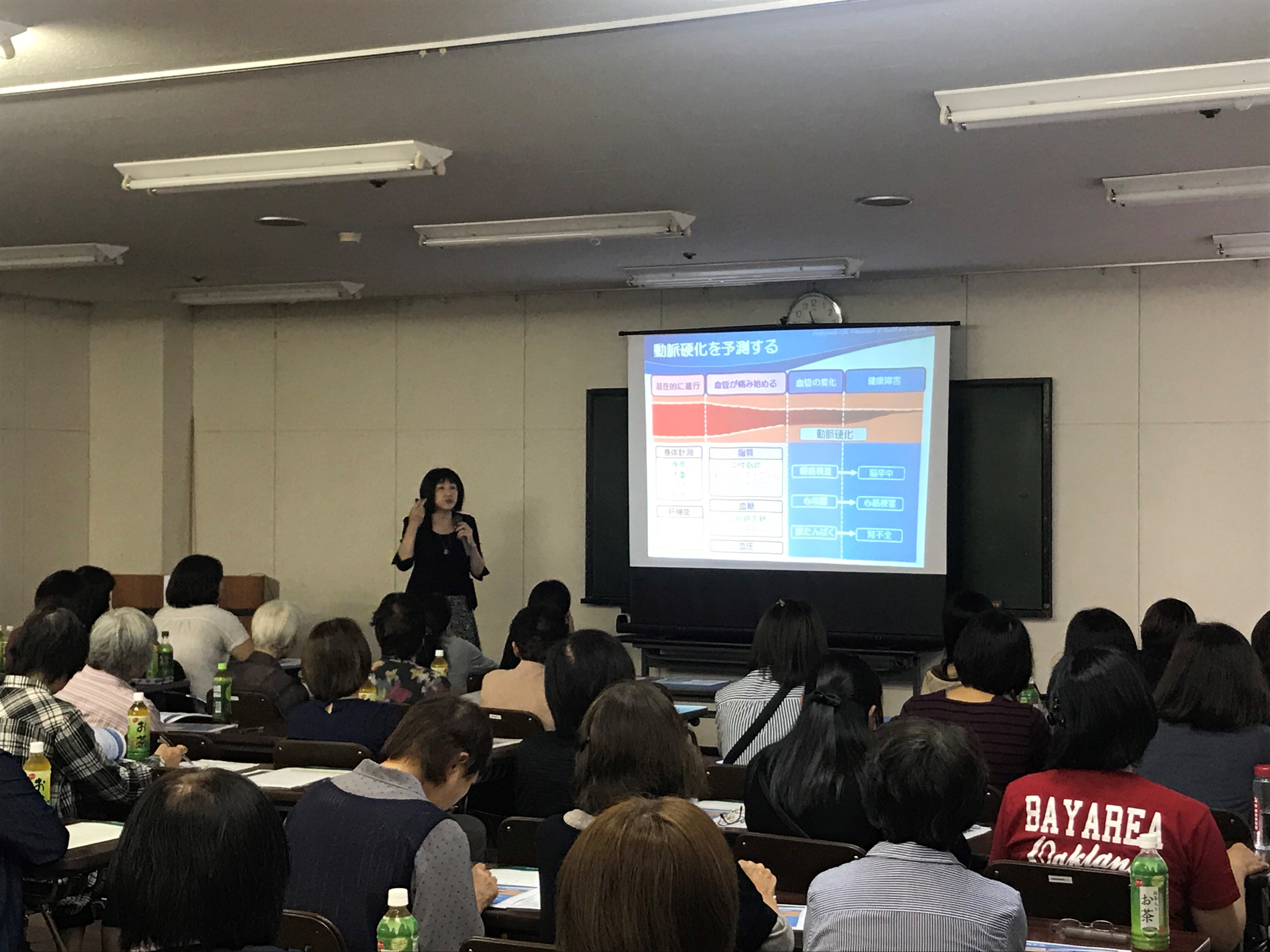 動脈硬化が原因の疾患は、がんに匹敵するほどの死亡要因を占め、また、介護が必要となる原因のひとつであることが知られています。今の日本の現状をみると、まさに「血管の健康づくり」が重要なテーマと考えられます。健診結果から自分の動脈硬化がどの程度進行していそうかを予想する方法や簡便にできる動脈硬化の測定法、動脈硬化の予防・改善に役立つ運動や食事の方法をご紹介しました。参加者の方からは、「ユーモアを交えわかりやすく話してくれたので、血管を健康に保つことの大切さがスッと頭に入ってきた」「実生活の中で役立てることが多い内容だった」等のご感想をいただきました。